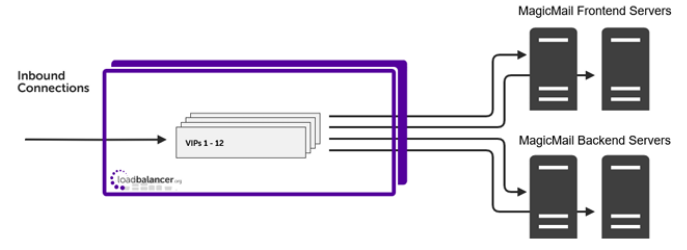 Once the load balancer is deployed, clients connect to the Virtual Services (VIPs) rather than connecting directly to one of the MagicMail servers. These connections are then load balanced across the MagicMail servers to distribute the load according to the load balancing algorithm selected: