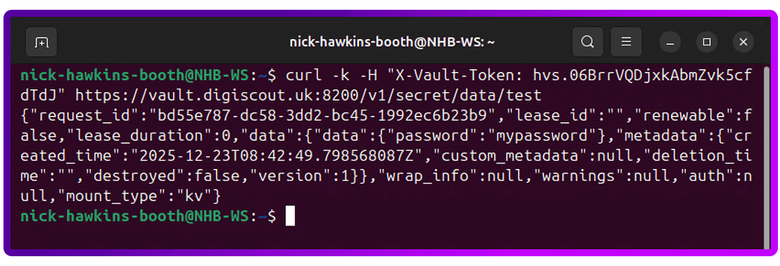 3. Now, read the secret back from the Vault: