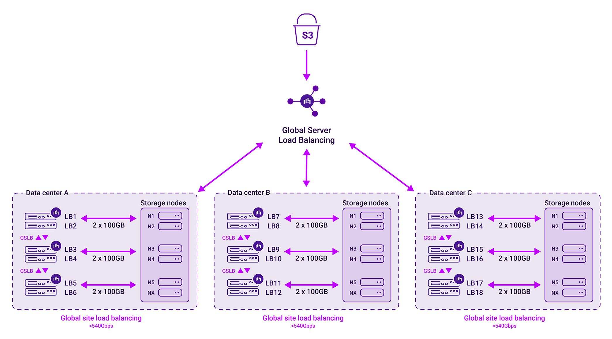 - Direct-to-node options: For specific high-performance use cases like storage clusters, we provide GSLB direct-to-node. This removes the load balancer from the traffic path entirely after the initial DNS resolution, allowing for unrestricted throughput, limited only by your network hardware.