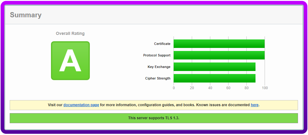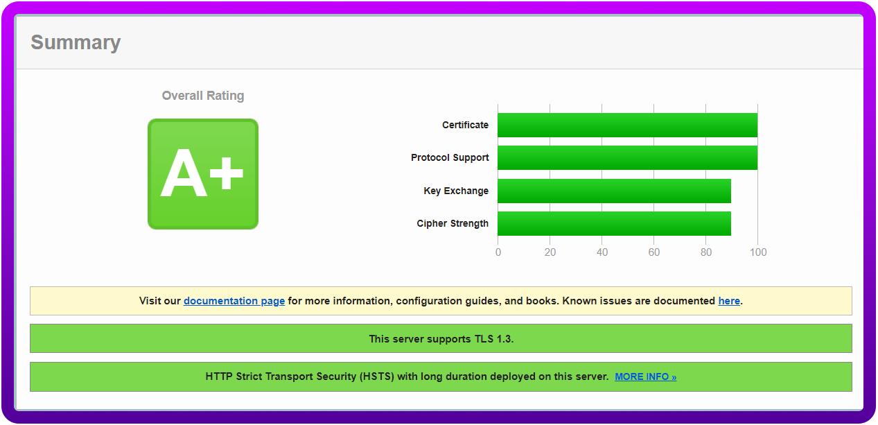 So, if you have got a signed certificate, and enabled HSTS on our load balancer, you should now be achieving an A+ Qualys rating. If you have further questions about SSL terminating on your Loadbalancer.dk appliance please get in touch and we will be happy to help!