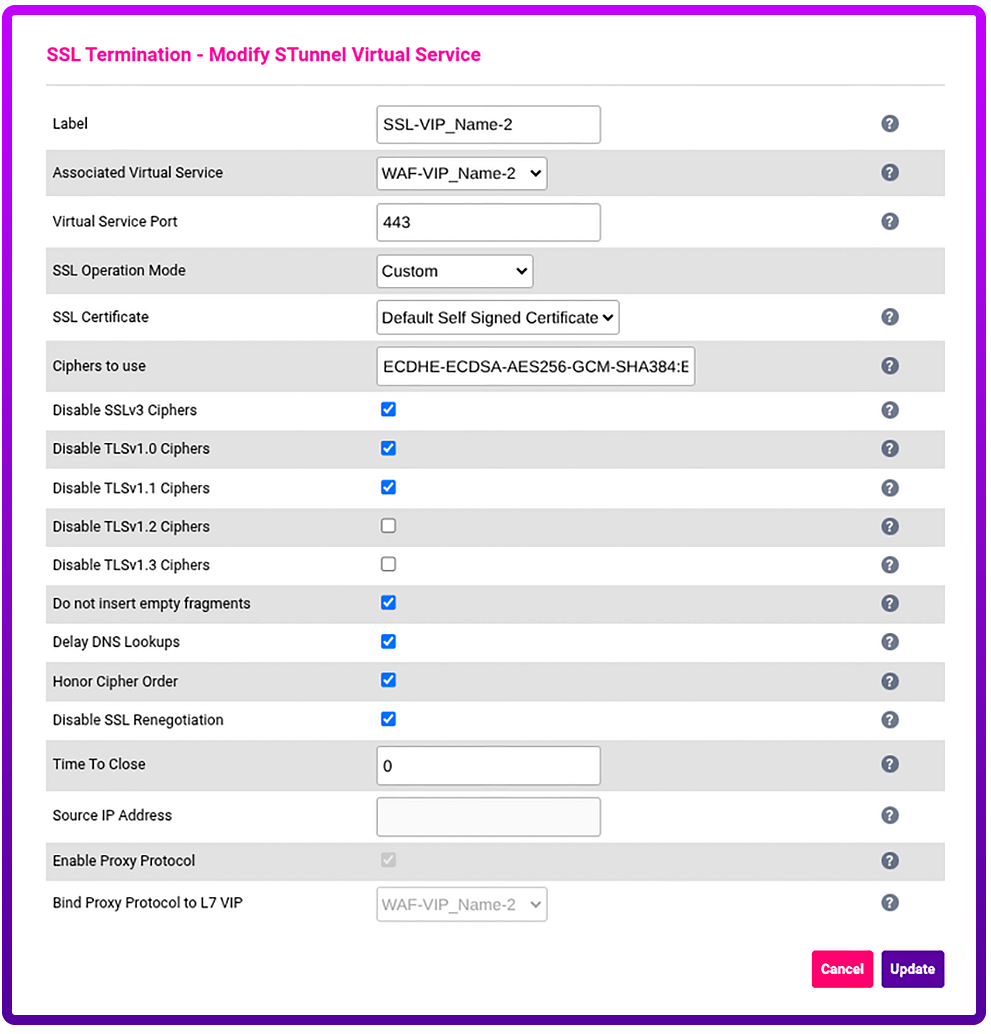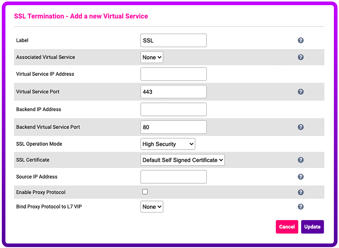 Once you have your certificate, attach it to your SSL termination and then choose the virtual service you want to terminate to. We have a range of default SSL operation modes, such as "High Security" "FIPs Compliant" and "high compatibility". These options can be found under the WebUI -> "Cluster Configuration" -> "SSL Termination".