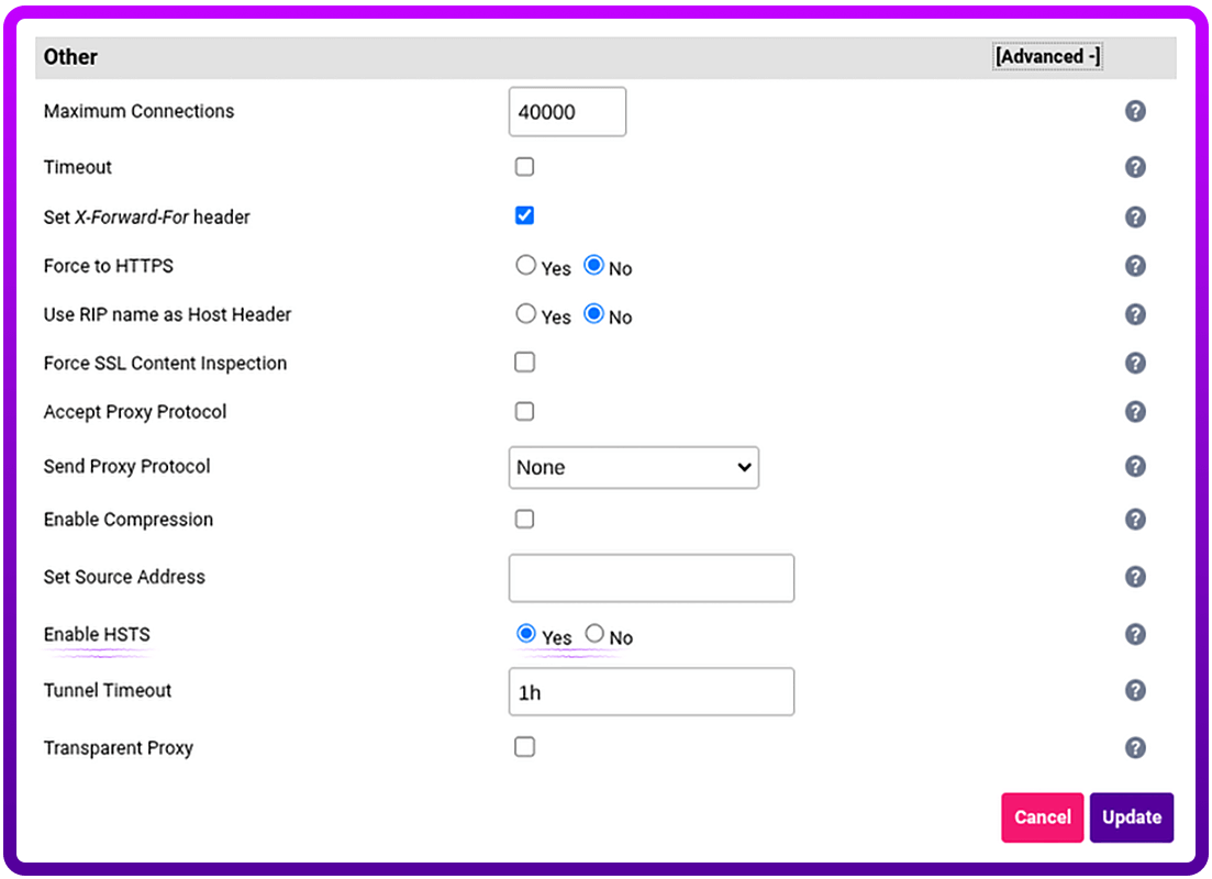 "What about the plus?" Well, the plus can be gained from a simple tick box when modifying the virtual service. If you modify your virtual service and scroll all the way to the bottom and select "Advanced" on the "Other" header, it reveals the all important "Enable HSTS" option!