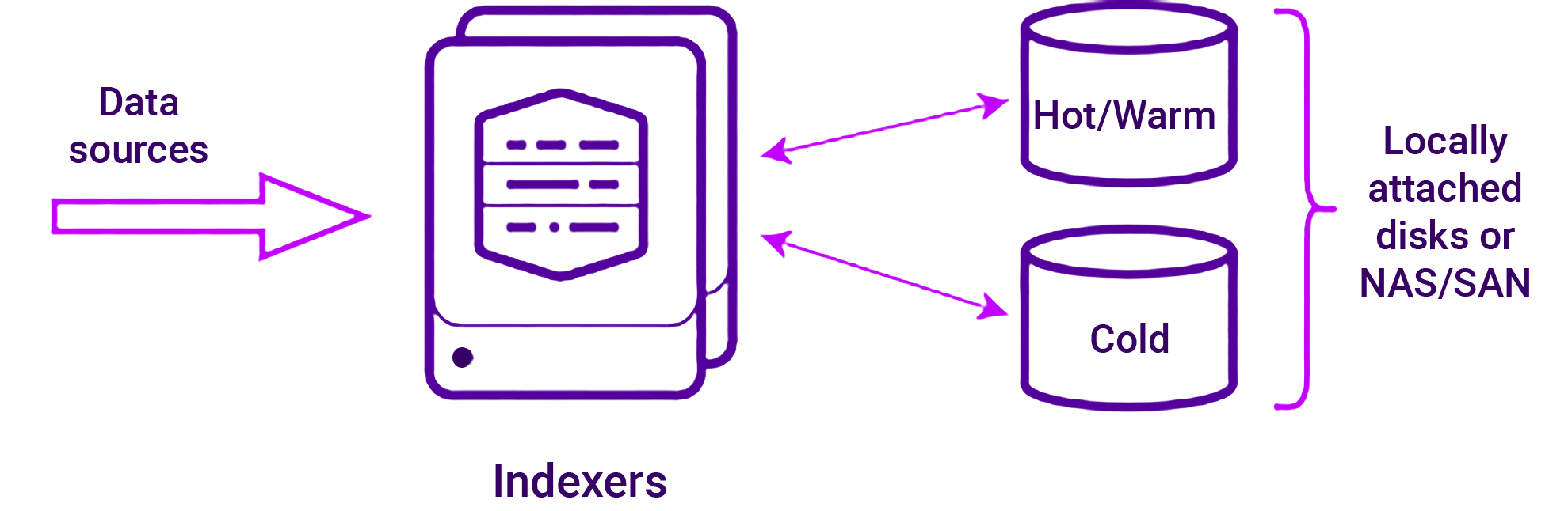 In the original classic architecture, indexers store data across the whole data lifecycle on a server accessible file system. This can be a direct-attached storage (DAS) filesystem only, or a combination of DAS storage and NAS or SAN storage.