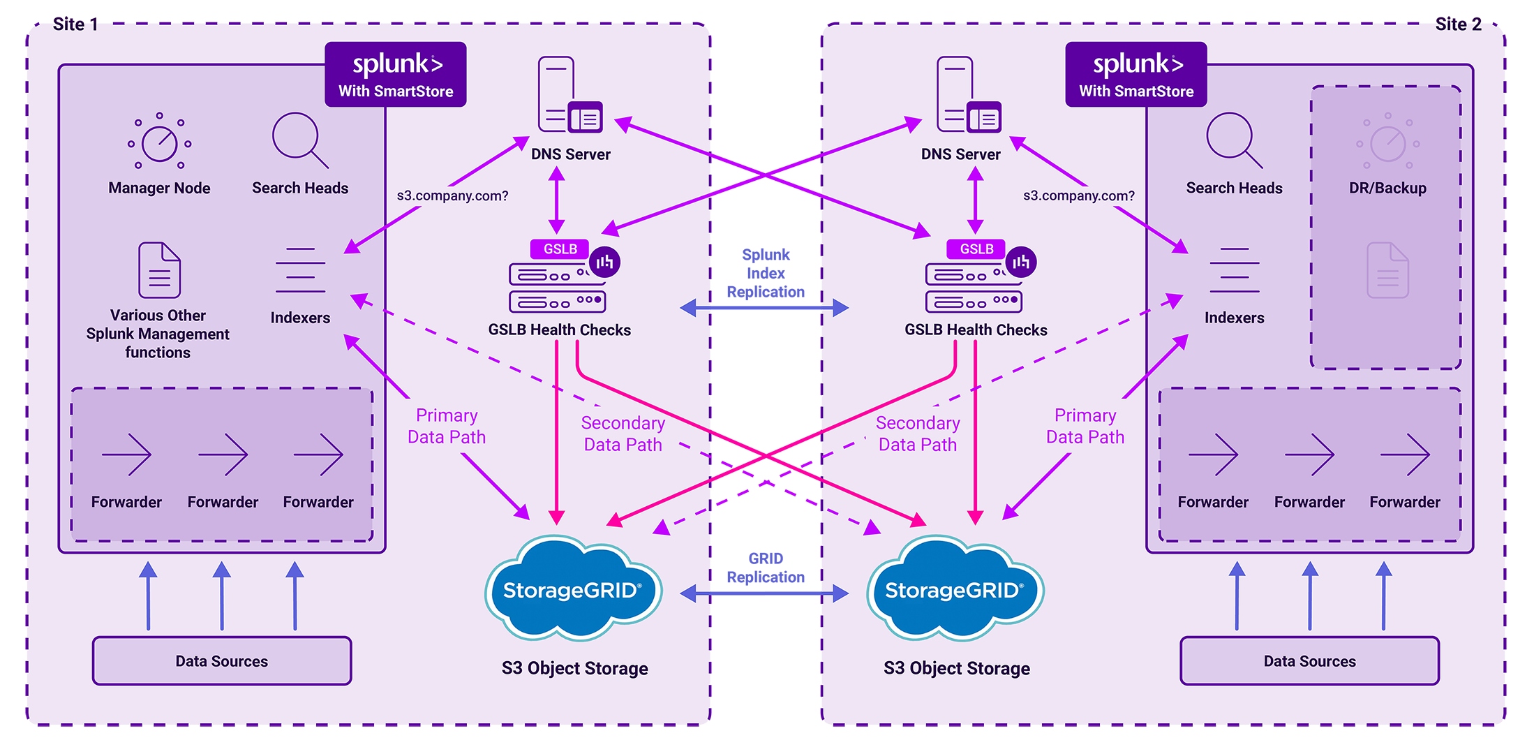 - GSLB for S3 Endpoint Resilience: Learn how Global Server Load Balancing (GSLB) uses DNS delegation to provide intelligent failover for the SmartStore sub-domain, ensuring continuous access to NetApp StorageGRID nodes across multiple sites.