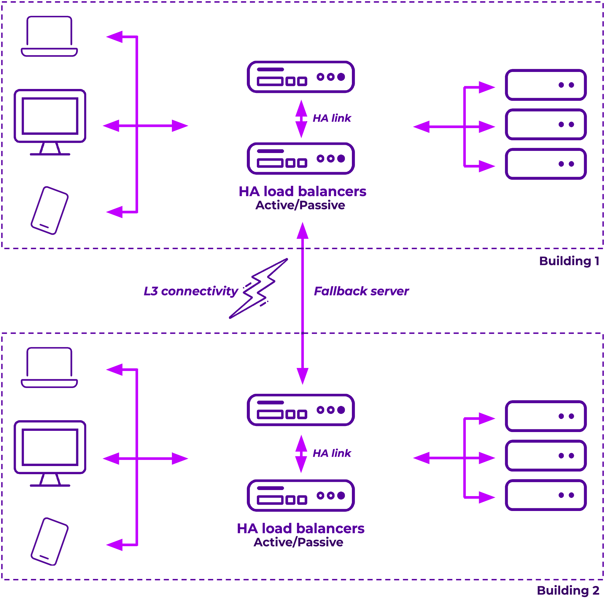 But, this has the drawback of needing one of the pair of load balancers also still available during such an outage to serve the fallback server... so it doesn't necessarily work during a complete server room failure unless you also host the servers in multiple rooms or at the very least I'd suggest separate racks. However, most commonly a total server room failure means the site has also lost connectivity so this is usually enough for most. If, however, you do have the requirement to survive a local server room failure entirely you could also use a DNS solution in tandem so clients could then still lookup DNS on the other side and get the remote answer.