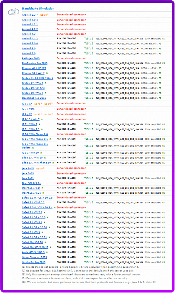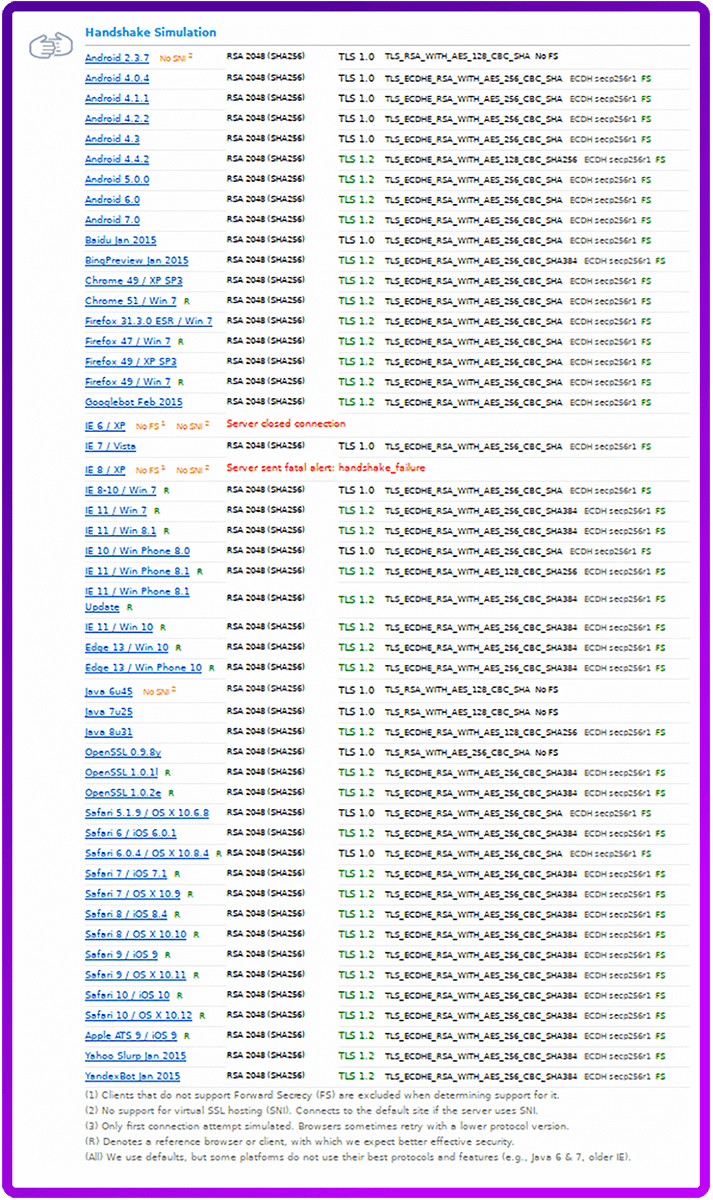 Another option is to use the full and complete FIPS list, but currently it will only give you an A- due to being capped. Annoyingly it’s a few reference browsers not negotiating a cipher that supports forward secrecy, however, client support is excellent and you can almost certainly expect that IE6 / WinXP client will work if they enable TLS1.0 support in IE.